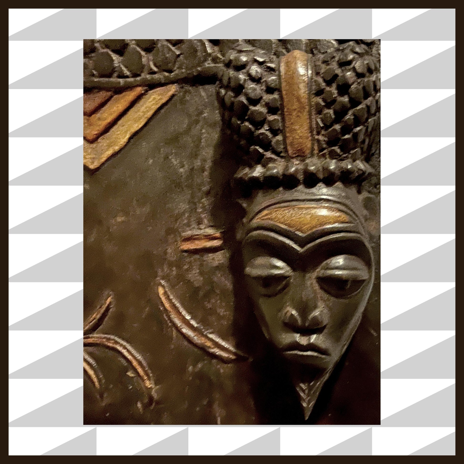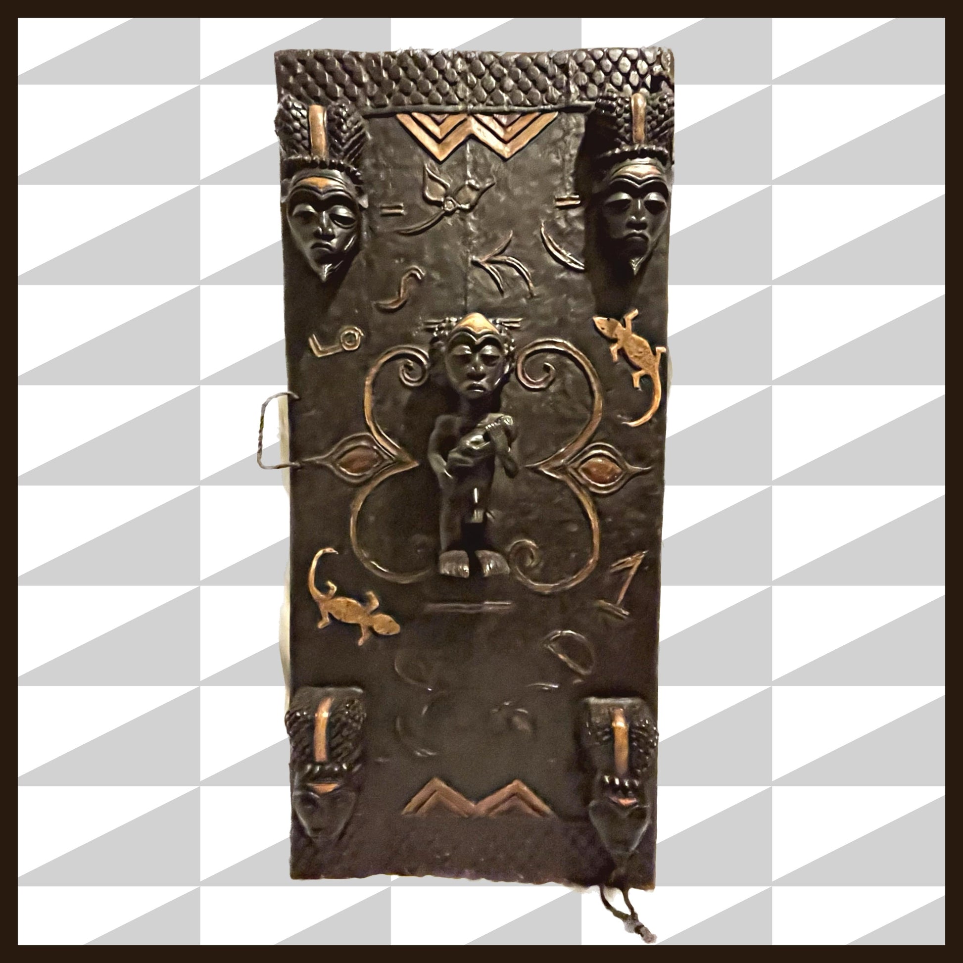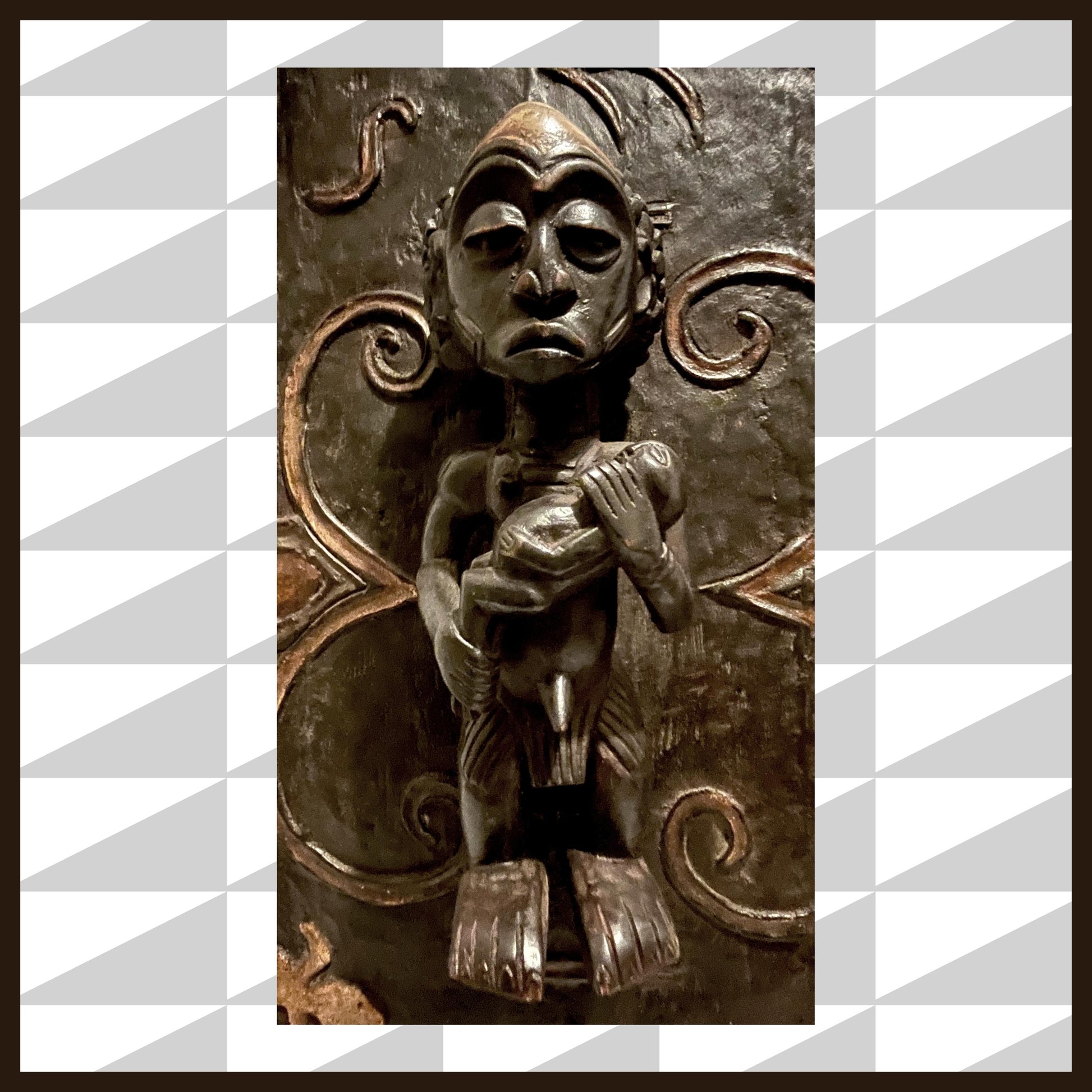 The Kuba People (Bakuba) of southwestern Congo (Congo-Kinshasa, Democratic Republic of Congo, DRC). This hand-carved door is functional with tribal engravings and attached statuettes and ceremonial masks. Secure the area of choice or display as art.